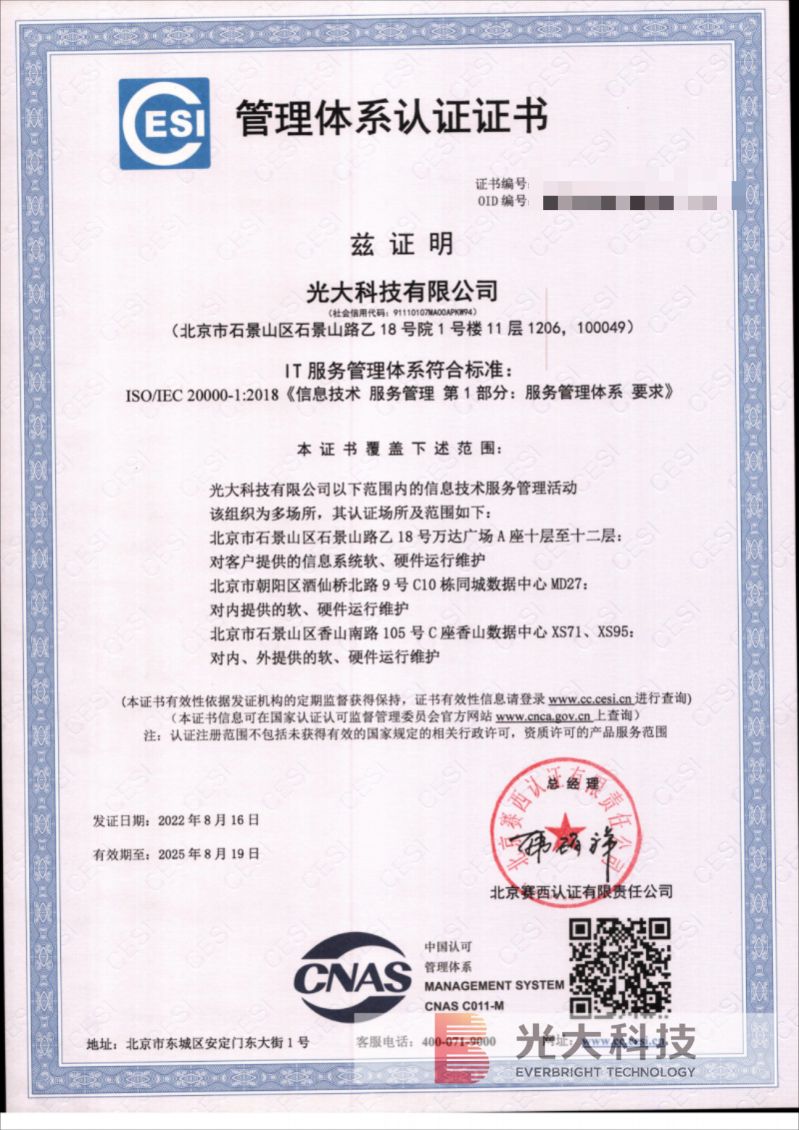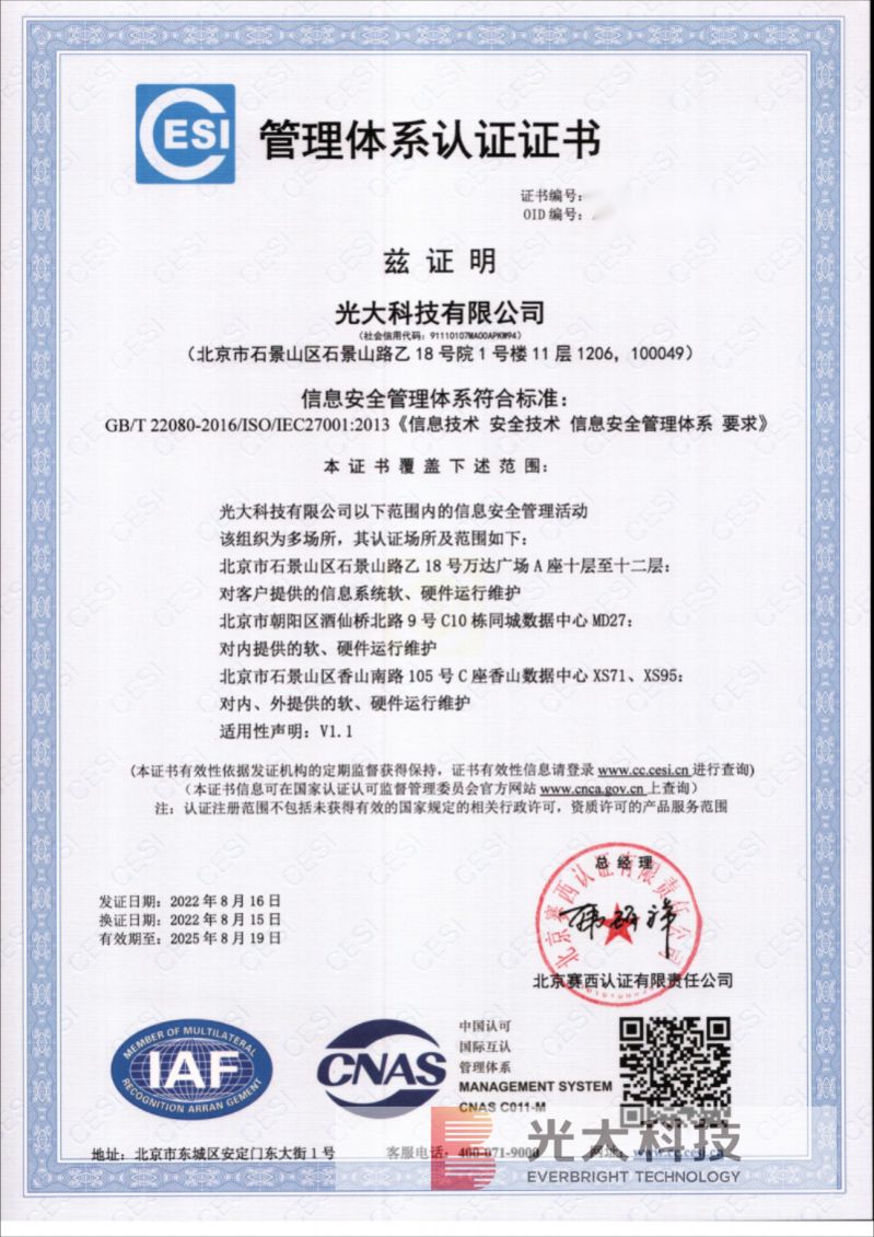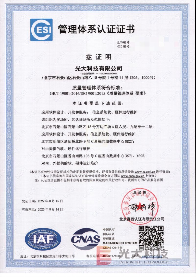 近日,光大科技成功通过了质量管理体系(GB/T 19001-2016/ISO9001:2015)认证,并再次通过信息安全管理体系(ISO/IEC 27001:2013)认证和信息技术服务管理体系(ISO/IEC 20000:2018)认证。