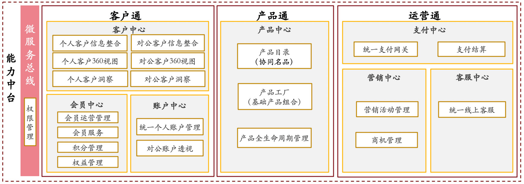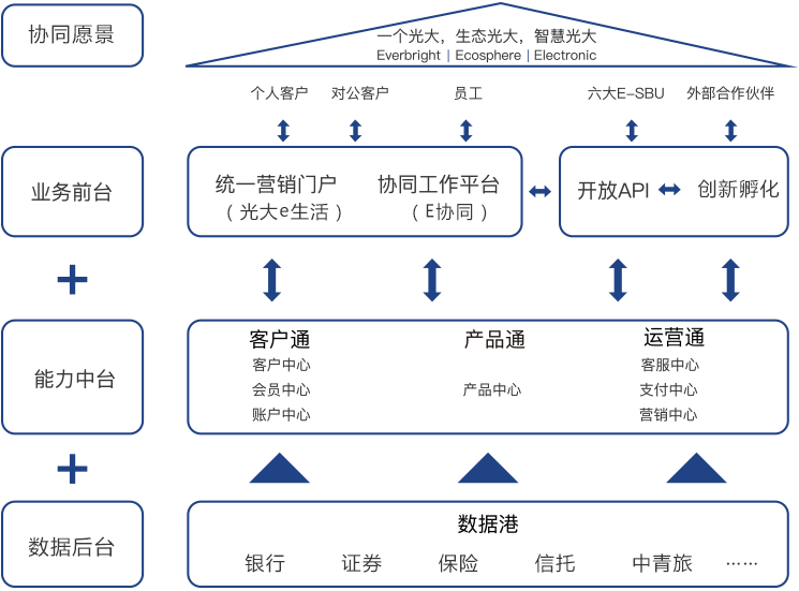 通过打造智能协同平台,构建客户、产品、运营三大能力中心,实现客户、产品、商机、营销、权益资源的共享,拉通内部企业和外部合作伙伴,建设合作共赢的生态圈。