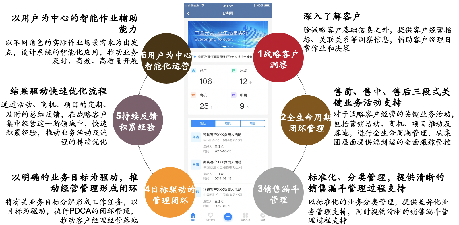 面向客户经理等管理及作业人员,围绕营销活动、商机、项目三个核心对象,聚焦三个闭环管理过程管理,进行关键业务活动管理和辅助作业能力建设,形成从事前计划、事中协同到事后跟踪的协同工作闭环管理,协助客户经理更有效的统筹规划各类资源,更好的服务客户,通过对客户以及协同工作的标准化管理起到客户经营辅助决策的作用。