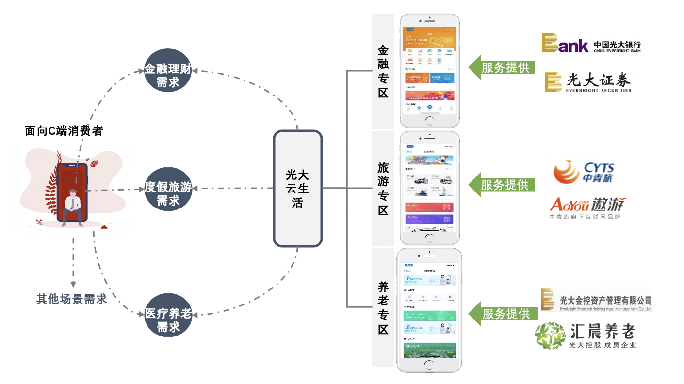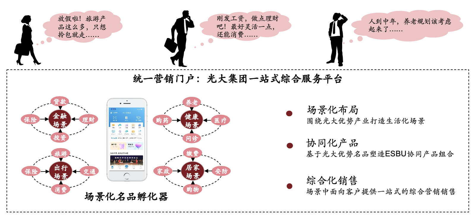 •    统一营销门户对外定位于集团的一站式综合服务平台,对内定位于集团的场景化名品孵化器,借助场景化的组合名品为C端客户提供一站式综合解决方案。