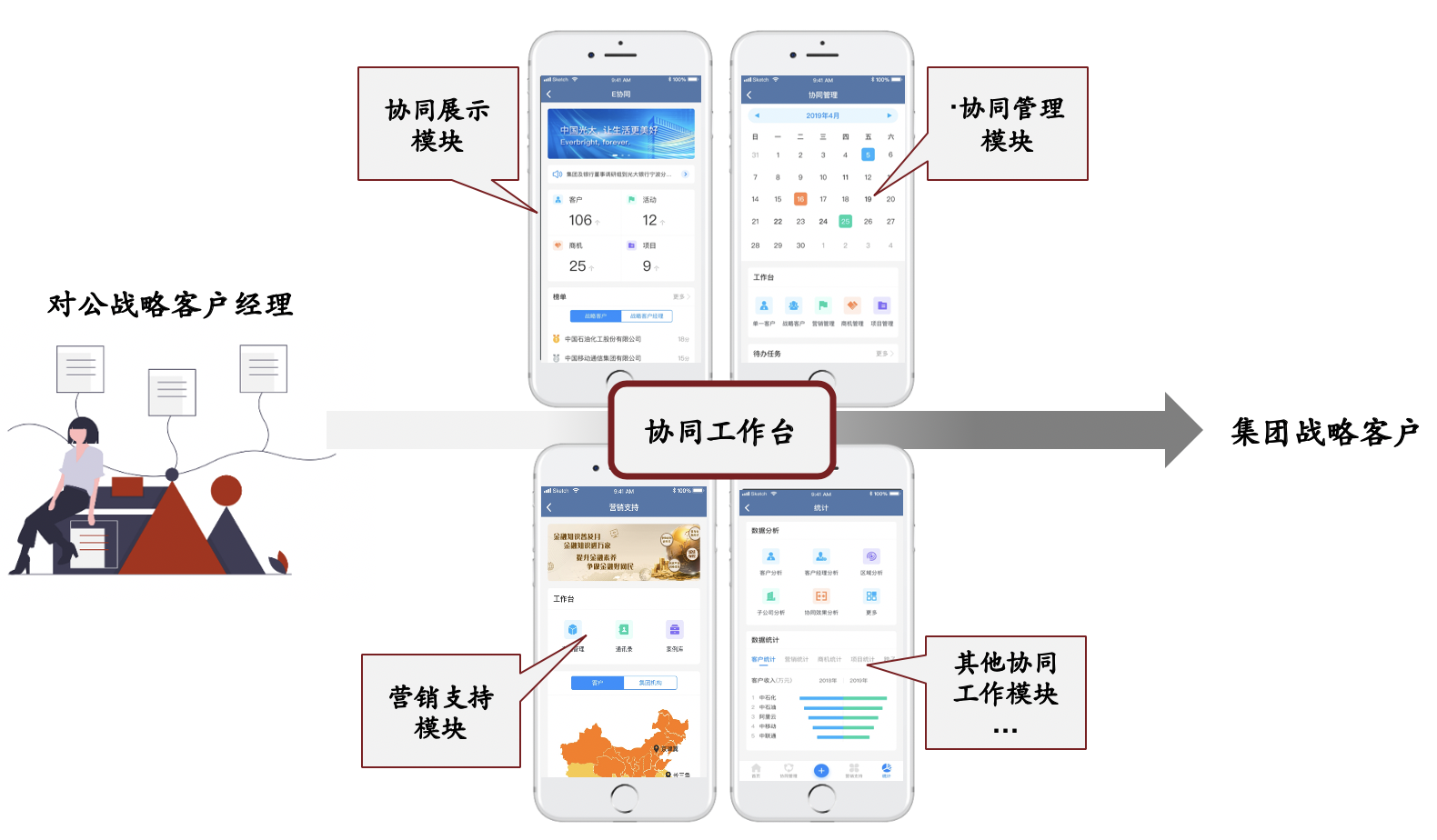 •   协同工作平台基于资源连接、协同作业支持、管理推动,实现集团战略客户、对公客户、个人客户的协同目标实现。