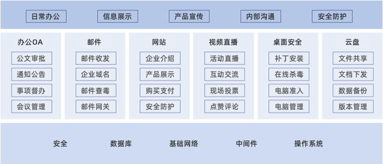 多种办公产品灵活组合,实现丰富业务功能,每一个产品均具有较强扩展性,满足企业规模扩展,以及系统之间的对接。