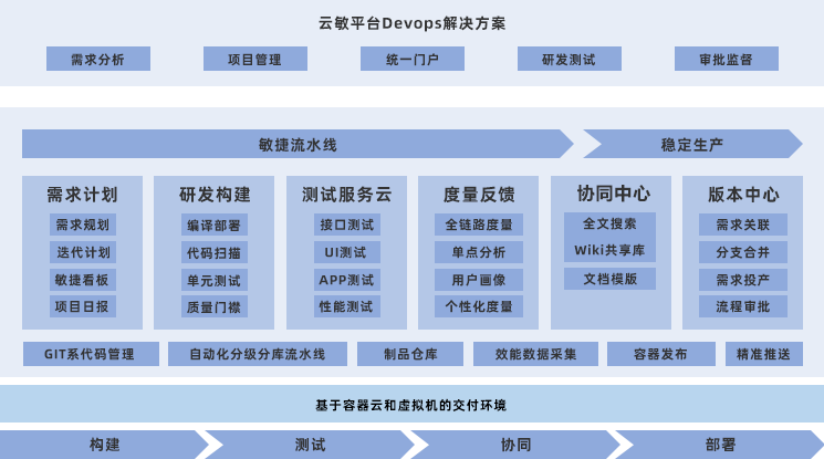 云敏DevOps平台是光大科技研发的金融企业双态DevOps平台,旨在促进『业务+开发+测试+运维』高效协同、加速项目价值交付、培养打造持续改进文化和护航组织转型落地。云敏采用微服务架构和插件化设计,包含组织中心、需求中心、代码中心、流水线中心、测试中心、精益看板和度量中心等核心模块,以CI/CD流水线和精益看板为基础,串联『需求规划-任务协作-代码开发-版本测试-制品部署』的端到端交付流程,通过自动化测试与部署提升质量和效率、通过可视化过程暴露瓶颈并促进改进、通过数据度量反馈形成闭环,为愿景、战略、业务、项目、团队和人员的目标统一奠定基础。