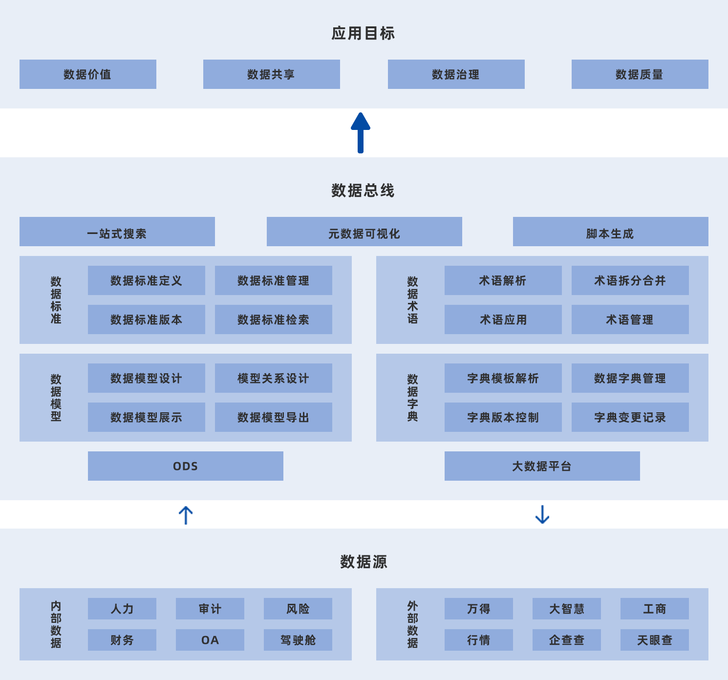 对整个数据中台内的数据进行统一查询、管理。面向数据开发者,汇聚用户所有数据信息,通过元数据信息收集、数据血缘探查、调度任务查询等手段,完成数据信息的收集和管理,解决"有哪些数据可用"、"到哪里可以找到数据"的难题,并且提升数据资源的利用率。