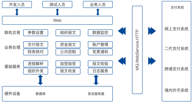 •   供用户在线发起或接收各类交易,包括支付类交易、信息类交易、对账类交易、清算类交易、对账类交易、参数维护等功能。